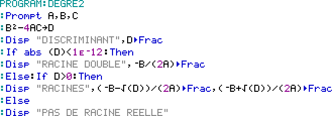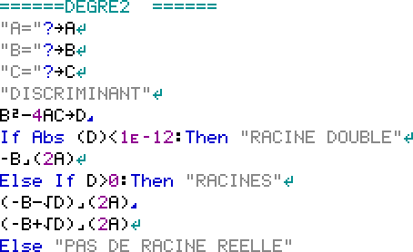 Programme DEGRE2 Le code suivant est volontairement réduit à sa plus simple expression. Libre à vous de laméliorer : forme canonique, tableau de signes, résolution dans lensemble des nombres complexes Noubliez pas de tester votre programme sur tous les exemples du livre. Pour les Casio